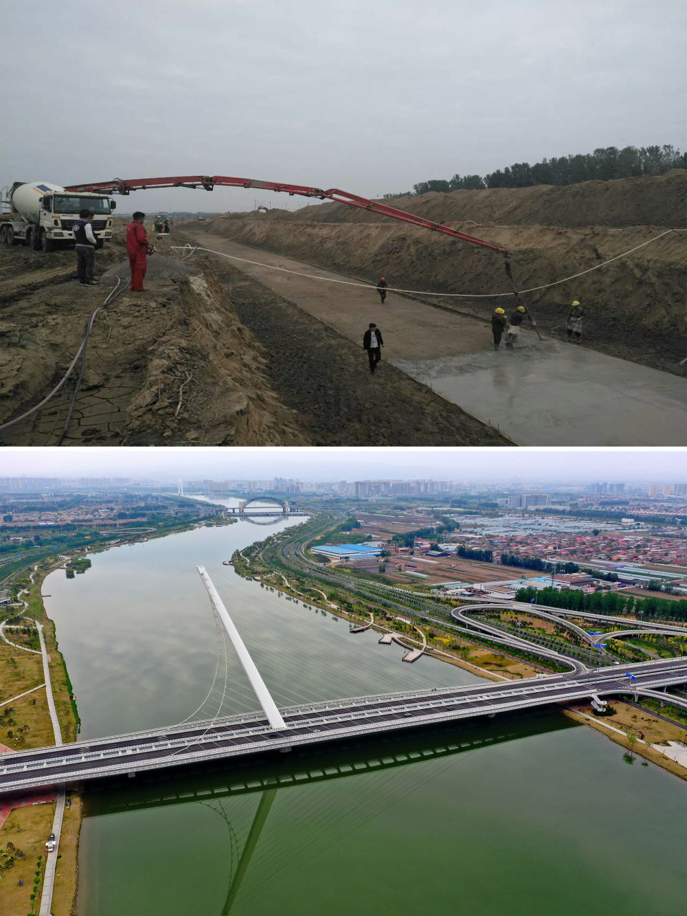 ↑拼版照片:上图为2017年10月5日拍摄的太原市汾河城区段治理美化三期工程施工场景(资料照片);下图为2020年4月29日无人机拍摄的太原市汾河两岸景色(新华社记者 曹阳 摄)。