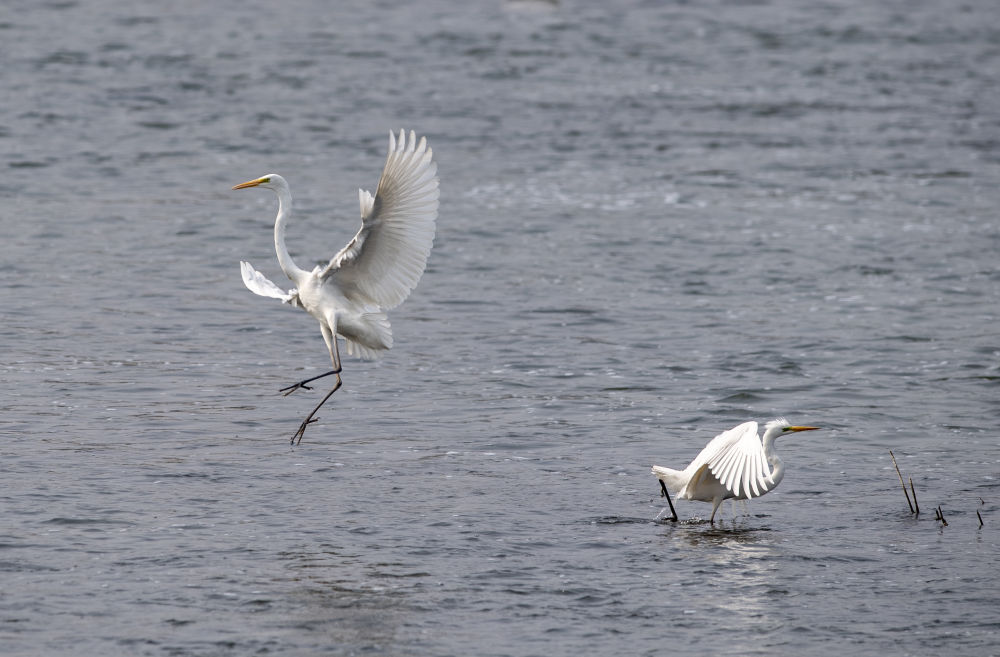 ↑这是水鸟在太原汾河公园嬉戏(2020年3月25日摄)。新华社记者 杨晨光 摄