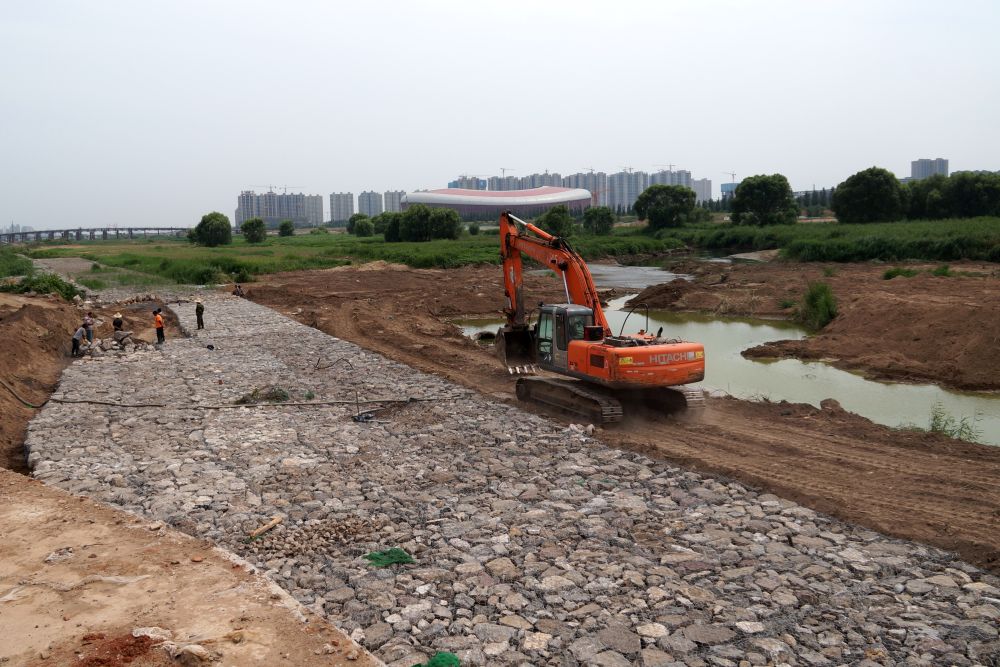 ↑这是2018年7月4日拍摄的太原市汾河城区段治理美化三期工程的施工场景(资料照片)。