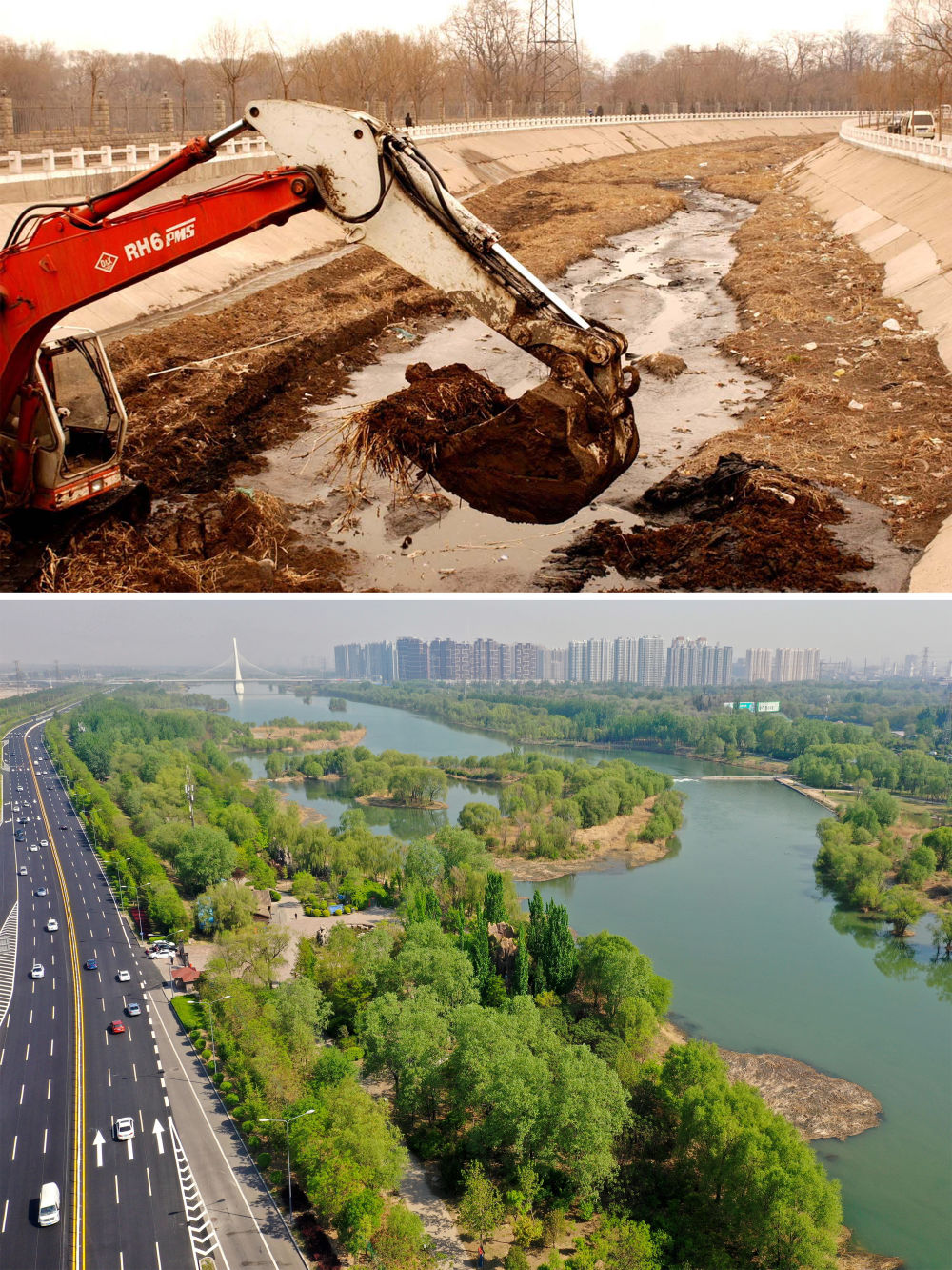 ↑拼版照片:上图为2003年3月28日,一台挖掘机在承担着太原市汾河以东中心区域防洪排水任务的南沙河河道中清理淤泥(资料照片);下图为2020年5月2日拍摄的太原市汾河两岸景色(无人机照片,新华社记者 杨晨光 摄)。