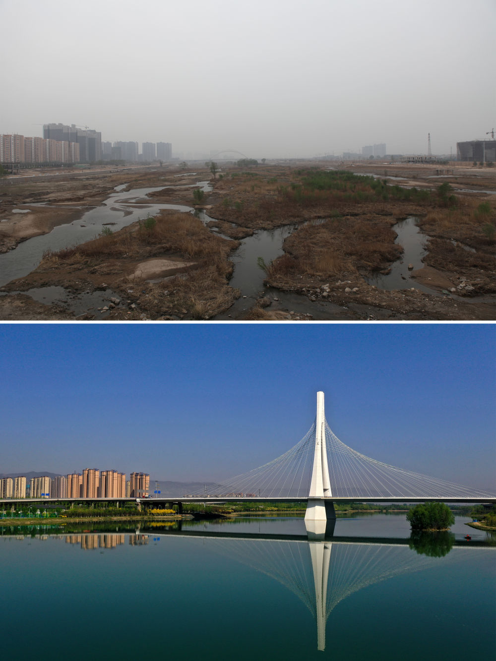 ↑拼版照片:上图为2011年4月20日拍摄的水量稀少的汾河太原段河床(资料照片);下图为2020年4月30日无人机拍摄的太原市汾河两岸景色(新华社记者 曹阳 摄)。