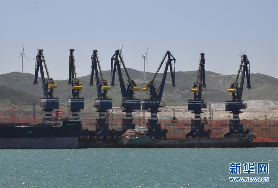 5月12日,船舶停靠在山东港口烟台港矿石码头进行装卸作业。新华社记者 朱峥 摄