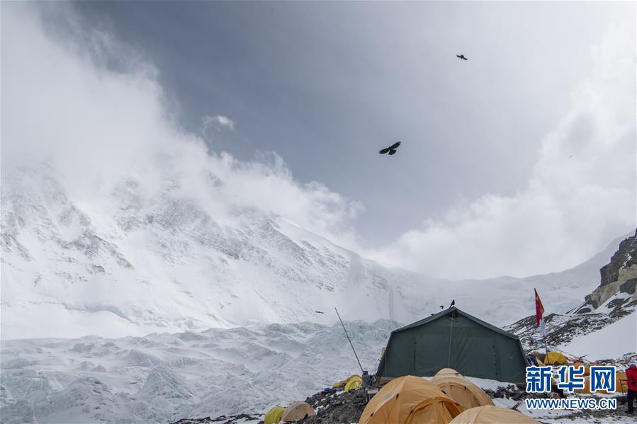 在海拔6500米的珠峰前进营地,几只黄嘴山鸦在空中飞翔(5月10日摄)。 新华社记者 孙非 摄