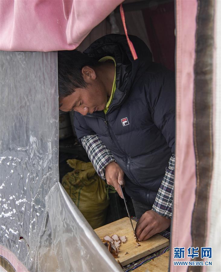 在海拔6500米的珠峰前进营地,一名高山厨师在准备菜品(5月10日摄)。 新华社记者 孙非 摄