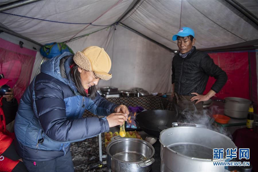 在海拔6500米的前进营地,高山厨师在准备菜品(5月10日摄)。 新华社记者 孙非 摄