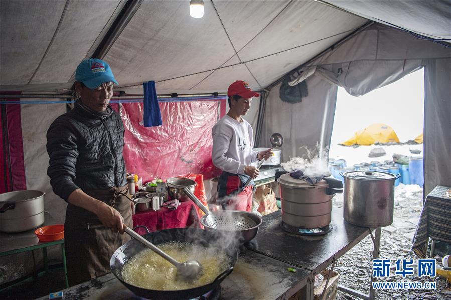 在海拔6500米的前进营地,厨师在制作菜品(5月10日摄)。 新华社记者 孙非 摄
