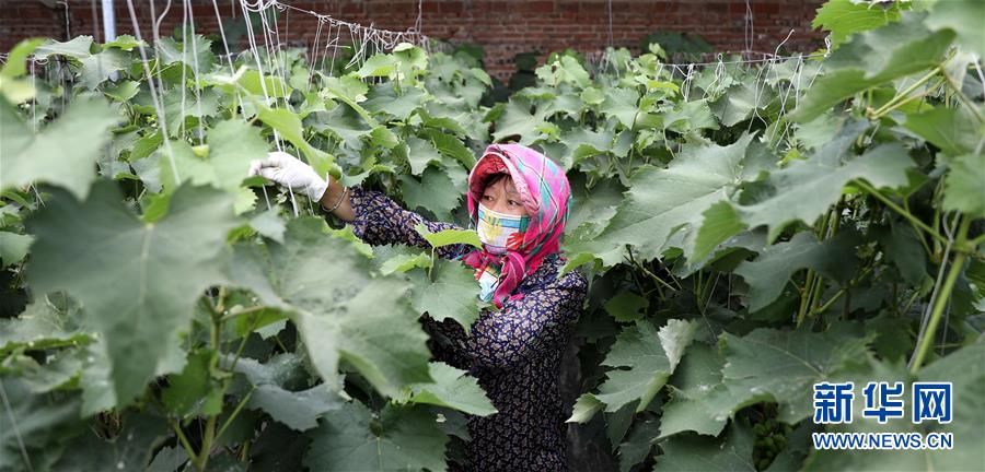 5月12日,一名工人在台安县缘泰农业有限公司的葡萄大棚里劳作。 近年来,辽宁省鞍山市台安县积极引导当地企业、农户发展大棚果蔬种植,丰富当地农产品种类,拓宽农业从业人员增收渠道。初夏时节,当地果蔬大棚里一片繁忙的生产景象。 新华社记者 姚剑锋 摄