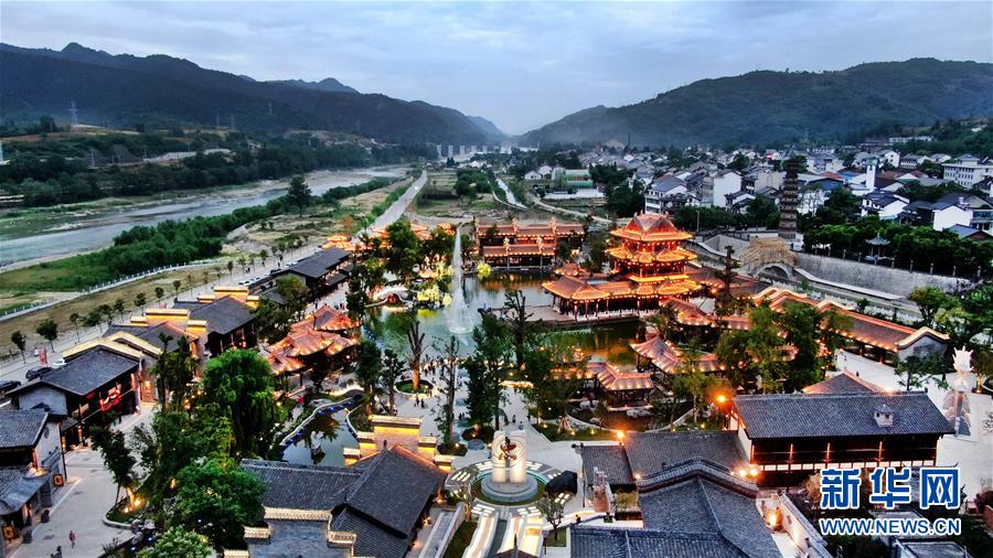暮色中的诸葛街景色(5月12日摄,无人机照片)。 近日,陕西省汉中市勉县武侯镇的诸葛街对外开放运营。诸葛街景区由汉式园林建筑及楼台水榭、亭廊阶石、木质亲水栈道等20多处景观组成,集旅游休闲、特色民宿、地方美食等为一体,服务游客的同时为760多人提供了就业。 新华社记者 陶明 摄