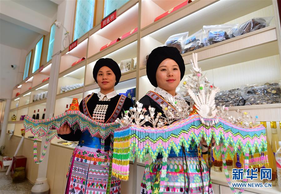 5月12日,在广西融水苗族自治县同练瑶族乡民族广场,瑶族姑娘在展示瑶族头饰。新华社记者 黄孝邦 摄