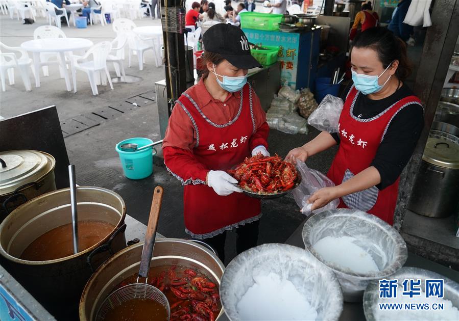 在金湖县龙虾美食广场,一家餐饮店的店员在准备小龙虾外卖(5月12日摄)。新华社记者 季春鹏 摄