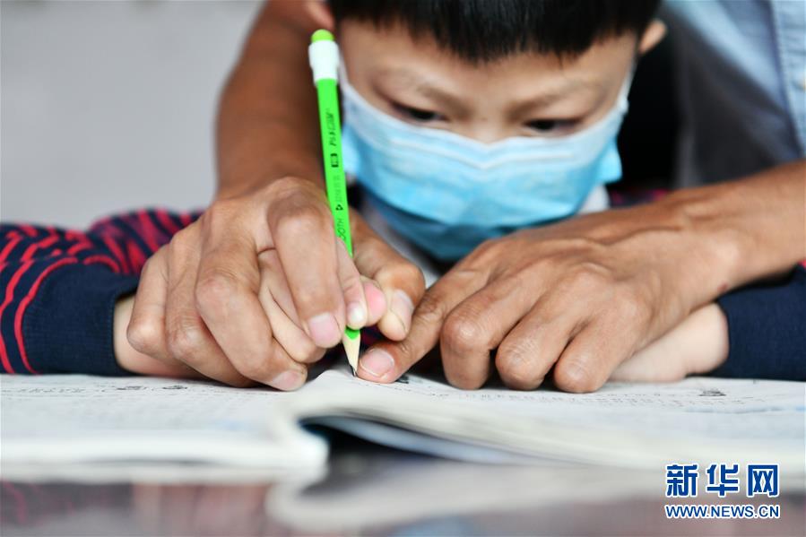 5月13日,在贵州省铜仁市思南县塘头镇青杠坝村,芭蕉教学点的教师在家访中指导一名低年级学生规范书写。新华社记者 杨文斌 摄
