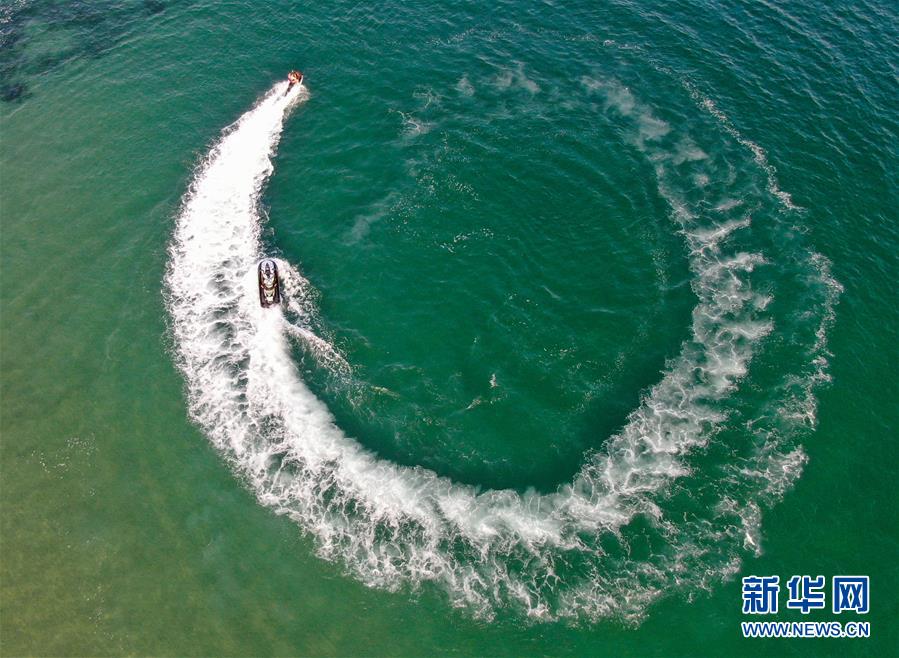 游客在海陵岛体验水上摩托(5月12日拍摄,无人机照片)。 海陵岛位于广东省阳江市西南部,天蓝海碧、山青沙洁,海洋渔业资源丰富。 新华社记者 邓华 摄