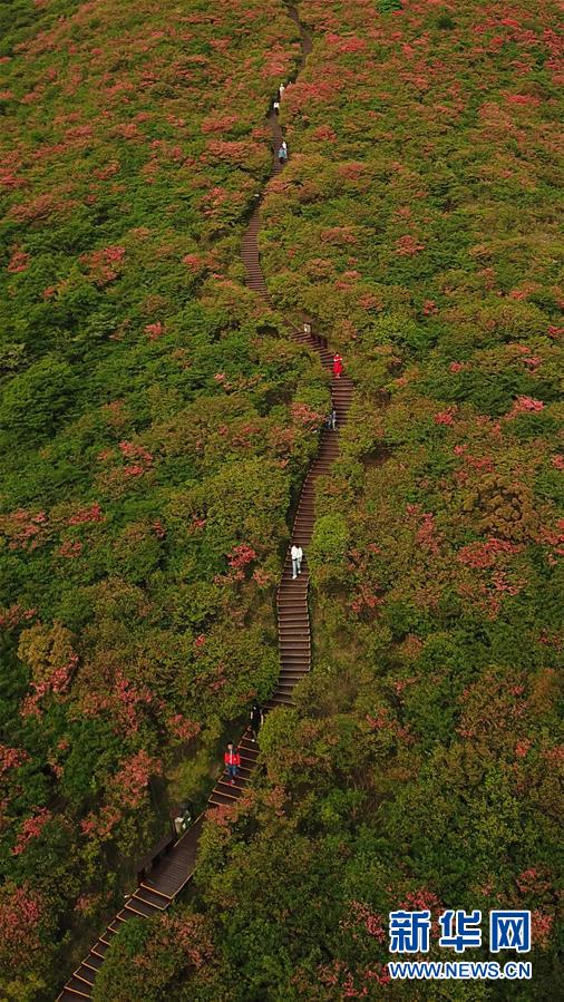游客在浏阳市大围山国家森林公园内观赏杜鹃花(5月13日摄,无人机照片)。 近日,湖南省浏阳市大围山国家森林公园内的野生杜鹃花竞相绽放,景色优美。 新华社记者 陈泽国 摄