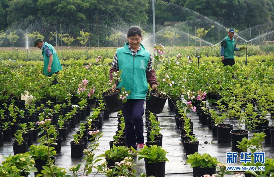 在江西省南昌市湾里区罗亭镇义坪村的“政通园艺”花卉基地,村民在搬运花卉(5月13日摄)。 新华社记者 万象 摄