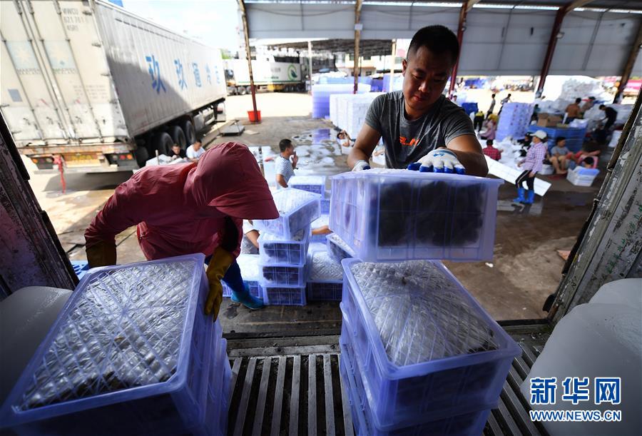 5月14日,工人在海口市琼山区三门坡镇的荔枝收购点把荔枝装车,准备运往北京。新华社记者郭程摄