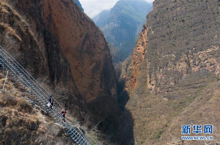 5月13日,莫色拉洛和妻子吉克阿牛带着两个孩子沿着“悬崖村”的钢梯下山,准备搬进昭觉县城易地扶贫搬迁安置点的新家(无人机照片)。新华社记者 江宏景 摄