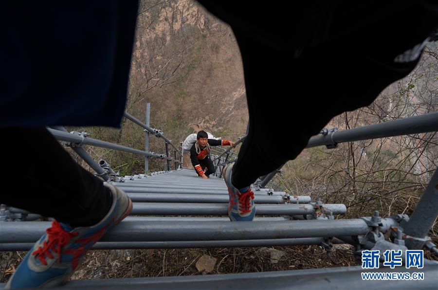5月13日,“悬崖村”村民沿着钢梯下山,准备搬进昭觉县城易地扶贫搬迁安置点的新家。下山时,在钢梯坡度较陡的地方,村民们往往需要转身面向崖壁,以保证安全。新华社记者 江宏景 摄