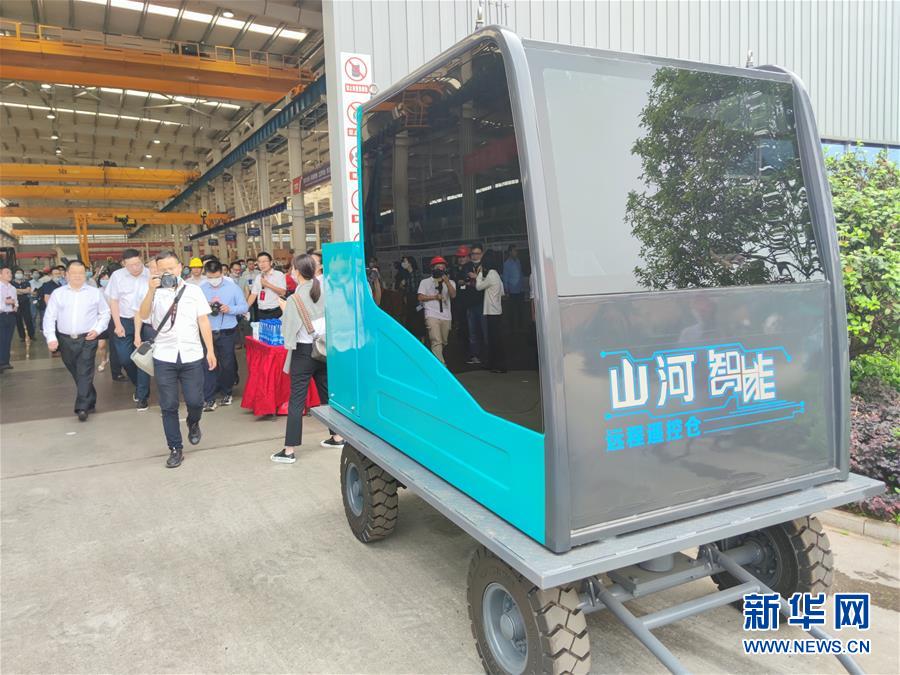 5月14日,在湖南省“5G+工业互联网”现场推进会上,企业负责人观摩山河智能装备集团的远程遥控仓。新华社发
