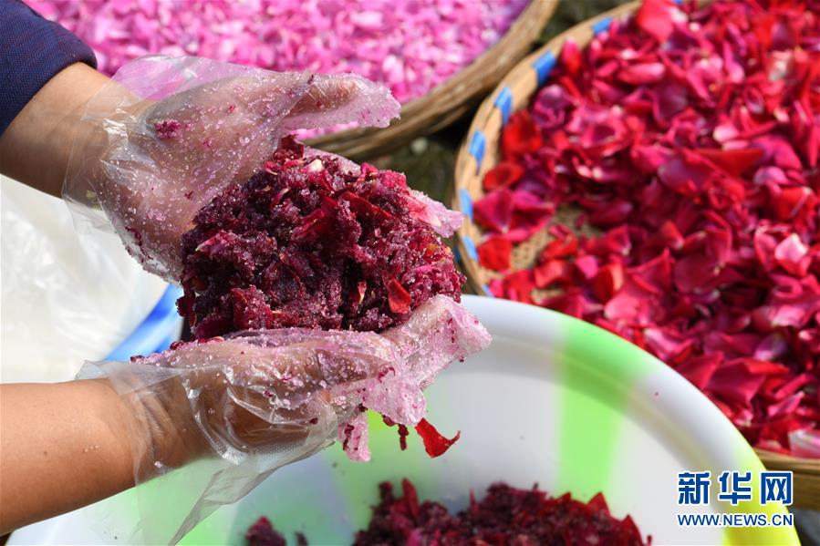 5月14日,在贵州省毕节市百里杜鹃戛木管理区中塘村鲜花基地,村民加工鲜花糖。 近年来,贵州省毕节市百里杜鹃戛木管理区大力发展以月季、玫瑰为主的鲜花产业,除供旅游赏花外,还进行鲜花深加工,生产花饼、花茶、花酒、花糖等产品,通过线上线下模式进行销售。 目前,戛木管理区已在中塘村、大堰社区打造了面积1000余亩的鲜花基地,“鲜花经济”已成为当地推动农旅融合发展,带动农民增收致富的主要产业。 新华社发(周燕林 摄)
