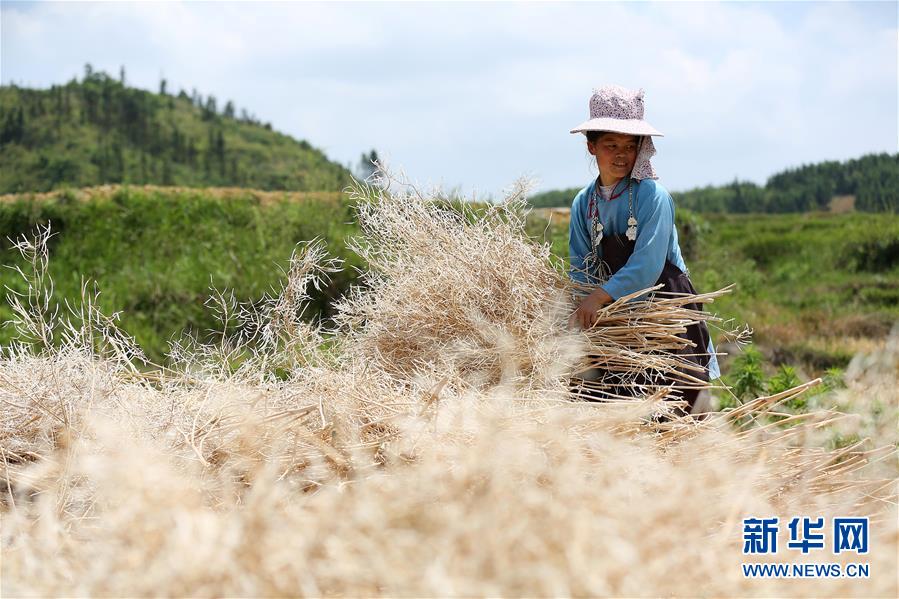 5月14日,在贵州省丹寨县扬武镇联盟村,村民在采收油菜籽。 近年来,贵州省黔东南苗族侗族自治州丹寨县引导农民利用林下土地及冬闲农田,发展林下经济产业和油菜籽种植。农民通过林地流转、务工获得增收,走出了一条有效利用山林闲地,促进农民增收致富的脱贫新路。 新华社发(黄晓海 摄)