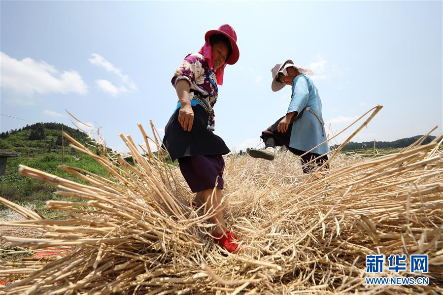 5月14日,在贵州省丹寨县扬武镇联盟村,村民用传统踩踏方式给油菜籽脱壳。 近年来,贵州省黔东南苗族侗族自治州丹寨县引导农民利用林下土地及冬闲农田,发展林下经济产业和油菜籽种植。农民通过林地流转、务工获得增收,走出了一条有效利用山林闲地,促进农民增收致富的脱贫新路。 新华社发(黄晓海 摄)