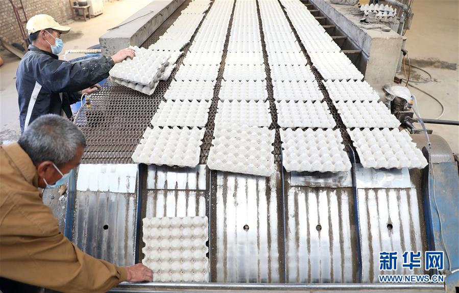 5月14日,工人们在台安县大台蛋托厂生产作业。 辽宁省台安县多措并举,积极帮助县内乡镇企业解决在复工复产中面临的困难,引导有序复工,带动当地就业,实现增收。 新华社记者 姚剑锋 摄