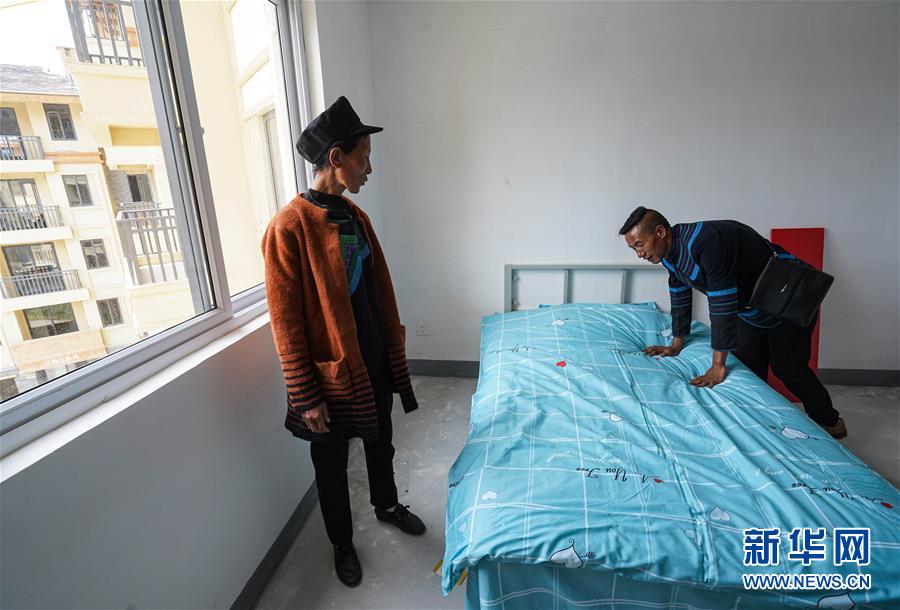 5月13日,在昭觉县城易地扶贫搬迁安置点南坪社区新家里,莫色达体夫妇给女儿莫色拉作布置床铺。新华社记者 江宏景 摄
