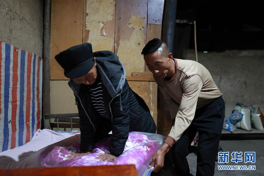5月13日,莫色达体和妻子巴格阿里早早起床收拾行李。 新华社记者 江宏景 摄