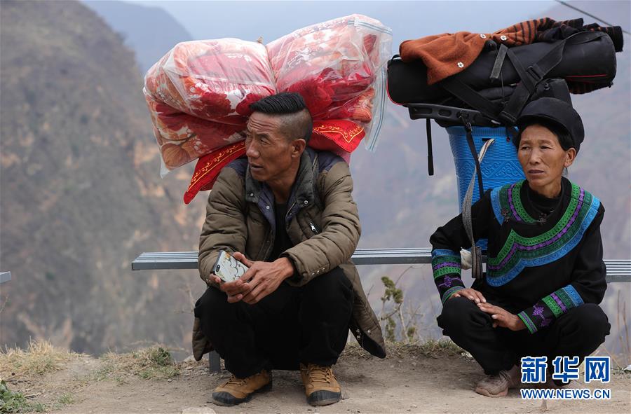 5月13日,莫色达体夫妇背着行李在下山途中休息,不时回头向村子仰望几眼。 新华社记者 江宏景 摄