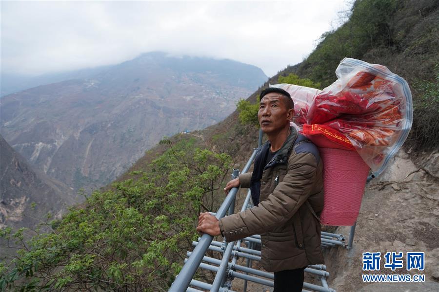 5月13日,莫色达体背着行李在下山途中休息,不时回头向村子仰望。新华社记者 江宏景 摄
