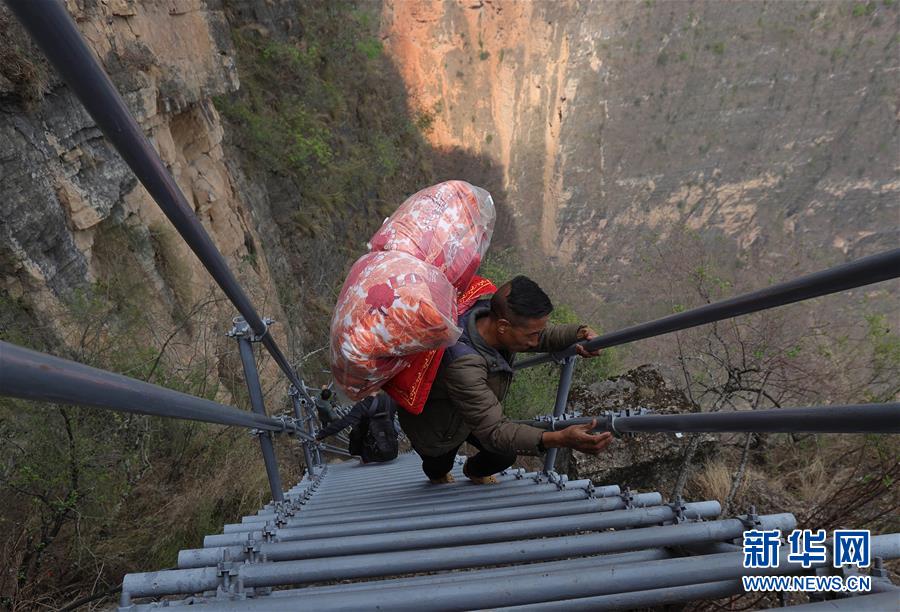 5月13日,莫色达体背着行李通过坡度最陡的几段钢梯。下山时,在钢梯坡度较陡的地方,村民们往往需要转身面向崖壁,以保证安全。 新华社记者 江宏景 摄