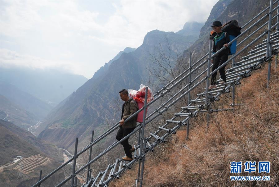 5月13日,莫色达体夫妇背着行李走下钢梯,在坡度不大的地方,“悬崖村”村民在钢梯上如履平地。新华社记者 江宏景 摄