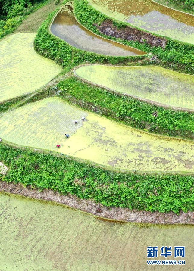 5月15日,湖北省宣恩县高罗镇大茅坡营村的村民在梯田中插秧(无人机照片)。 时下,湖北省恩施土家族苗族自治州宣恩县高罗镇大茅坡营村千亩梯田进入插秧季,蓄水的梯田、劳作的农民与传统民居构成了一幅美丽的农耕画卷。 新华社发(宋文 摄)