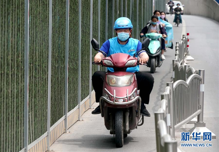 王新洲行驶在送餐的路上(5月14日摄)。新华社记者 李安 摄