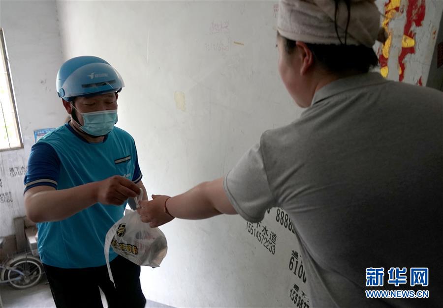 王新洲(左)将外卖交给客户(5月14日摄)。新华社记者 李安 摄