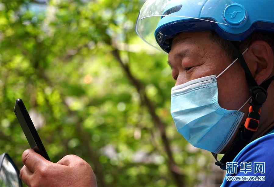 王新洲在使用手机接单(5月14日摄)。新华社记者 李安 摄