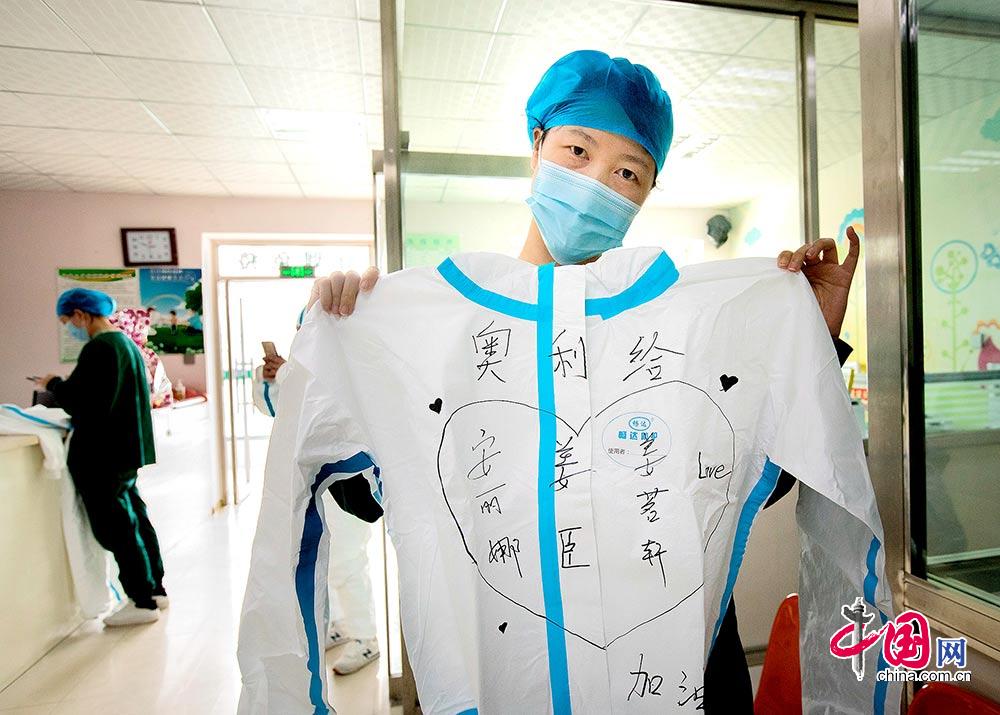 安丽娜医生已经100多天没看到家人和孩子了,她在防护服写上家人的名字,拍照片发给家人和亲友,已寄相思和鼓励。李广庆摄影
