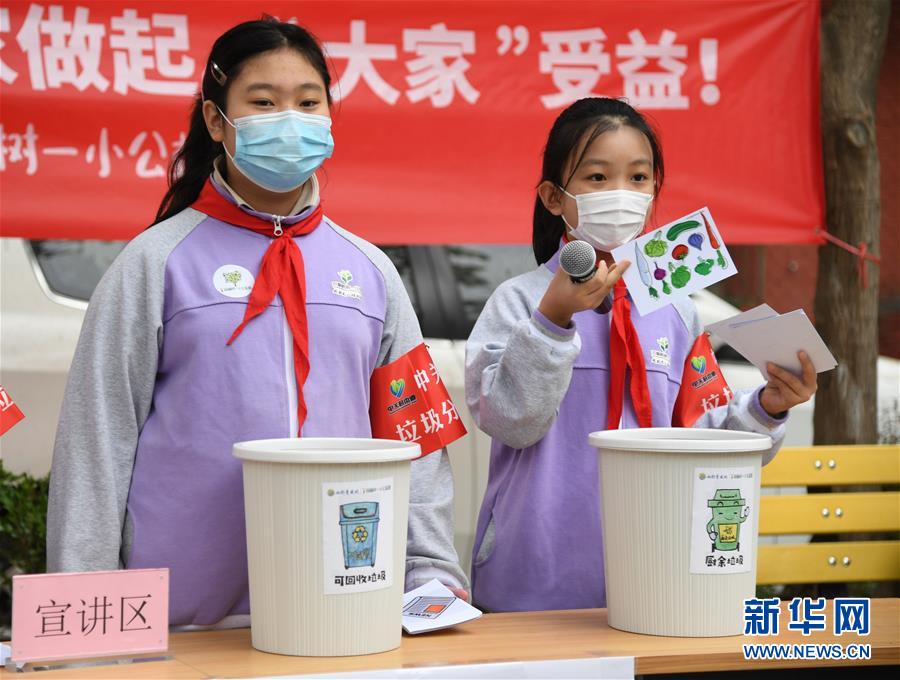 5月16日,在北京中关村街道青云北社区,双榆树第一小学四年级学生胡欣然(右)在向社区居民介绍垃圾分类知识。 当日,北京市海淀区双榆树第一小学的学生来到中关村街道青云北社区进行垃圾分类公益宣传活动。同学们通过展示垃圾分类标识、介绍垃圾分类知识等,与社区居民一起学习了解垃圾分类知识,爱护社区环境卫生。 新华社记者 任超 摄