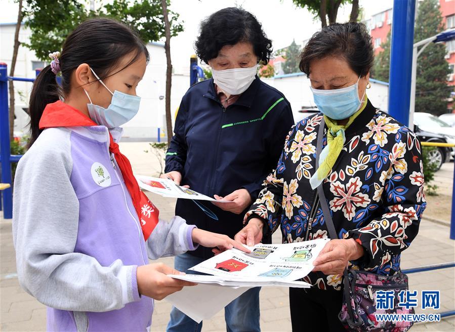 5月16日,在北京中关村街道青云北社区,双榆树第一小学四年级学生张祖宁(左一)在向社区居民发放垃圾分类宣传贴纸。 当日,北京市海淀区双榆树第一小学的学生来到中关村街道青云北社区进行垃圾分类公益宣传活动。同学们通过展示垃圾分类标识、介绍垃圾分类知识等,与社区居民一起学习了解垃圾分类知识,爱护社区环境卫生。 新华社记者 任超 摄
