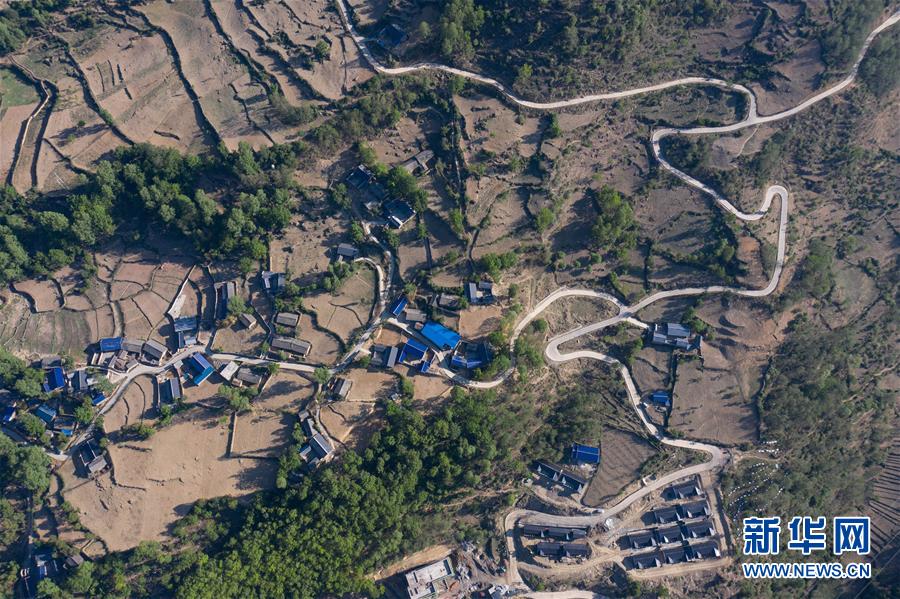 俯瞰昭觉县庆恒村一角,安全住房依山而建,通村路进行了硬化(5月9日摄,无人机照片)。新华社记者 江宏景 摄