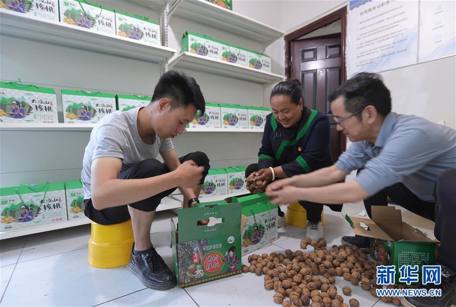 吉克石乌(中)和庆恒乡综合帮扶队队长谢成刚(右)、驻村工作队队员王帝森一起包装核桃(5月8日摄)。新华社记者 江宏景 摄