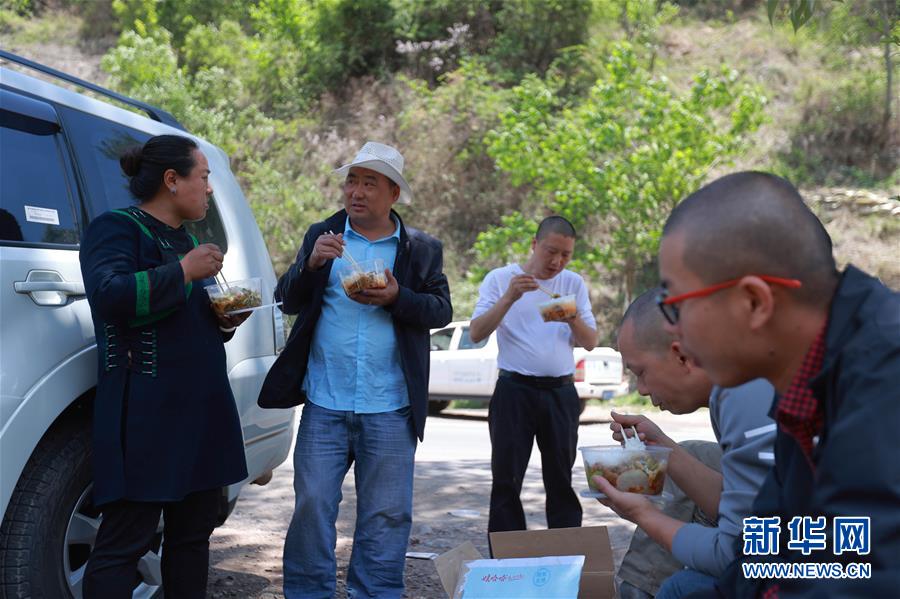 吉克石乌(左一)在乐西高速公路过境拆迁区域,和施工方边吃午饭边交流情况(5月9日摄)。新华社记者 江宏景 摄