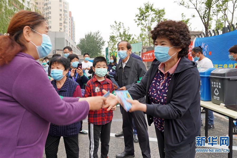 5月16日,东高地街道志愿者为社区居民发放垃圾分类知识手册。 当日,北京市丰台区东高地街道举行“垃圾分类,文明同行”活动,开展垃圾分类手册发放、垃圾分类知识比赛、学生志愿者培训等活动,200多名居民、学生和志愿者参加活动。 新华社记者李欣摄
