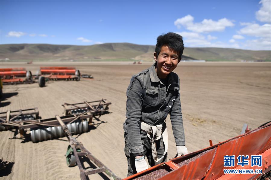 5月16日,在青海省三江集团门源种马场的油菜田里,韩富财站在播种机上准备播种。新华社记者 张宏祥 摄