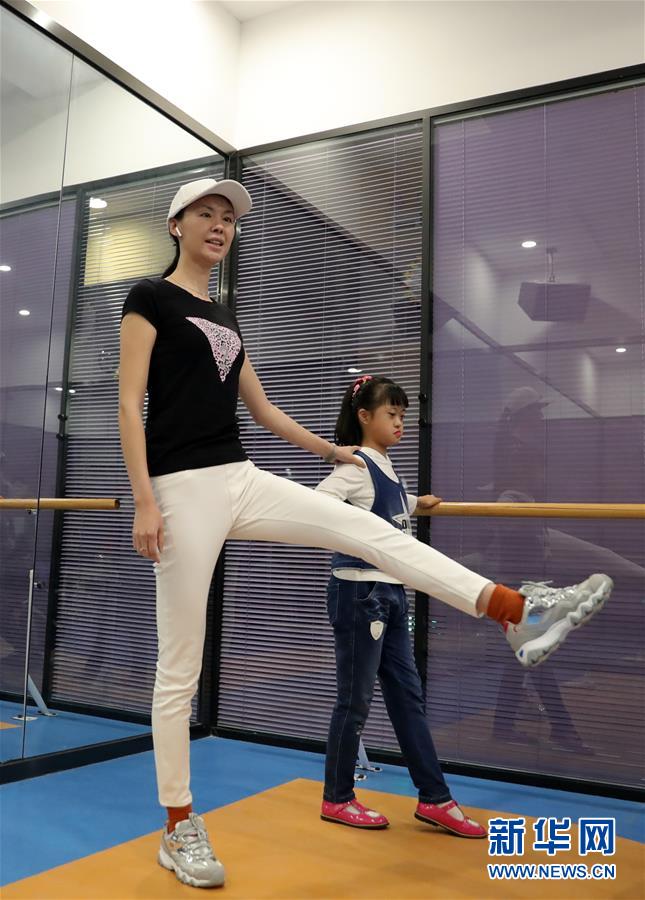 5月13日,在沈阳拾艺影视艺术明星学校,王蕾蕾(左)对残障儿童进行形体训练。新华社记者 杨青 摄