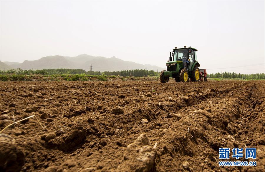 5月16日,播种机在河北省武安市伯延镇杨二庄村田地里作业。 初夏时节,位于太行山区的河北省武安市25万亩谷子迎来播种季,农民抢抓农时,利用农机开展播种工作。 新华社记者 牟宇 摄