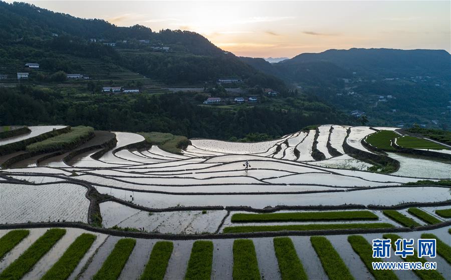5月15日拍摄的秭归县沙镇溪镇长春村的梯田(无人机照片)。 初夏时节,湖北省宜昌市秭归县沙镇溪镇长春村层层叠叠的梯田美如画卷。村民抢抓农时进行插秧,田间地头一派忙碌景象。 新华社发(郑家裕 摄)