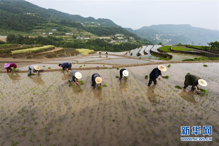 5月16日,秭归县沙镇溪镇长春村八组村民在田间插秧。 初夏时节,湖北省宜昌市秭归县沙镇溪镇长春村层层叠叠的梯田美如画卷。村民抢抓农时进行插秧,田间地头一派忙碌景象。 新华社发(郑家裕 摄)