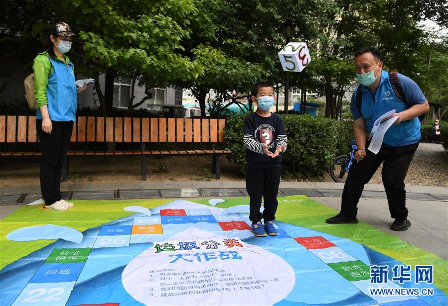 5月16日,在北京学院路街道富润家园社区,一名小朋友参加“垃圾分类大作战”互动项目。 当日,在做好新冠肺炎疫情防控的前提下,北京市海淀区学院路街道团工委在富润家园社区举办垃圾分类主题趣味运动会,让大家了解垃圾分类知识,增强垃圾分类意识,爱护社区环境卫生。 新华社记者 任超 摄