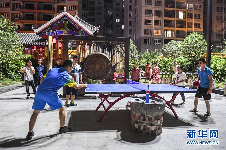 居民在广西大化瑶族自治县古江安置区内打乒乓球(5月15日摄)。 近年来,广西大化瑶族自治县深入推进易地扶贫搬迁工作。目前古江安置区已有2217户10000多人入住。当地注重将易地扶贫搬迁与美食小镇建设相结合,拓宽安置区就业创业渠道,加大配套公共设施建设,让搬迁群众在县城安居乐业。 新华社记者 曹祎铭 摄
